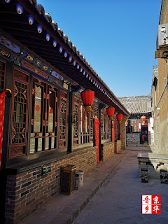 一个高高的大门,写上了“晋泰生”三个字。门上的雕刻与装饰十足的大户人家的模样。大门的尽头就是一幅砖雕的影壁,影壁旁又是另外的门才能进入大院。简单的入房手续后,老板亲自带我们去这两晚的房间。房间位于旁边的小院,属于新建的单层房。房间屋顶为典型的山西风格,就是半边屋顶的单坡内落水建筑。山西地处内陆,干旱少雨,且风沙较大,将房屋建成单坡,能增加房屋临街外墙的高度,而临街又不开窗户,则能够有效地抵御风沙,提高安全系数。房间的门窗为传统的四合院装饰,七彩缤纷的彩绘,配合红色的门帐和红灯笼,气派十足。
